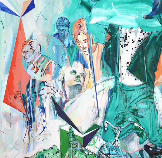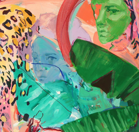 In my paintings I explore not only what is visibly seen on the canvas but also what comes up in between my subjects. Transparent curtains unearth humans, plants, animals, and geometric patterns and the interplay between them. That's why you'll find these abrupt lines representing the different dimensions compelling the viewer to explore their own relation to each aspect.