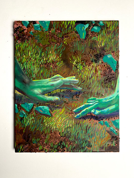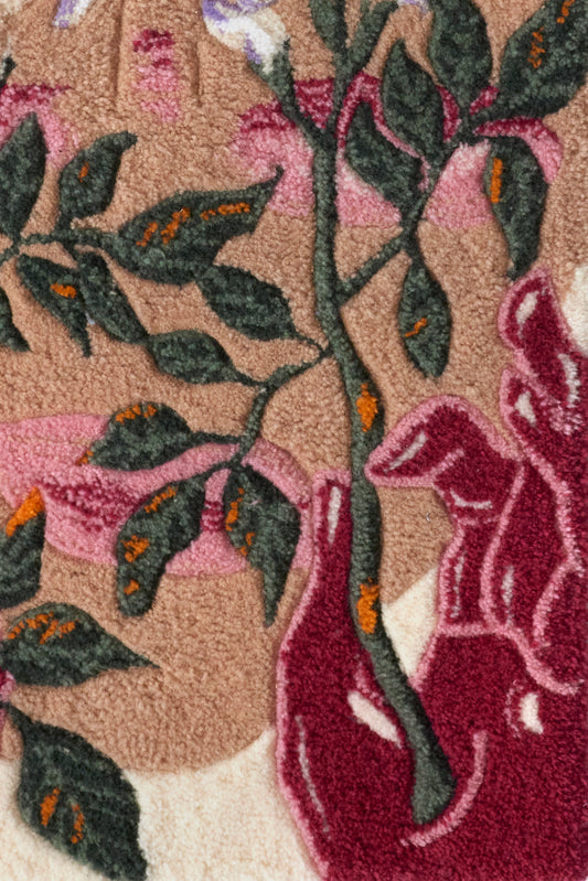 Enigmatic Interplay: Marijana Jankovic’s mysterious carpet engages with Fleur Helluin’s vibrant painting, where the mundane and the ethereal entwine, birthing a nostalgic dreamland.