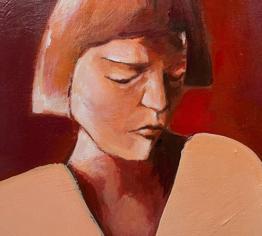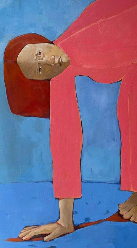 Irinka Talakhadze paints stoic women, solid women, each with what seems like a similar square haircut, each wrapped in colorful but plain and massive uniforms, holding a cigarette or a small briefcase. Are they part of some dystopian bureaucracy, maybe a Beckett play?