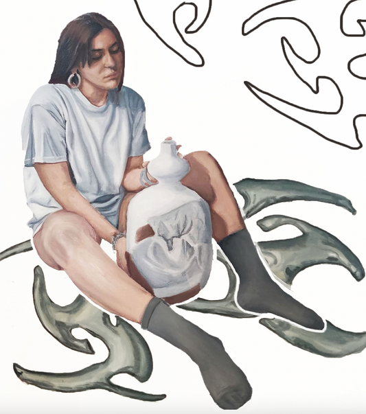 From a white void, young figures emerge, painted in Italian Renaissance style. Around them, no floor, no sky, no reality; only a few lines suggesting some drapery, but hanging above the subjects presides a large and metallic tribal sign, a glyph for a sun. Lost in a virtual realm, a realm of possibilities, the subjects are posing in a melancholic fashion. In this new collection, Jean-Louis Sabot portrays his generation, his community, his friends.