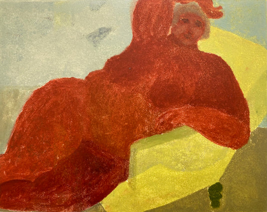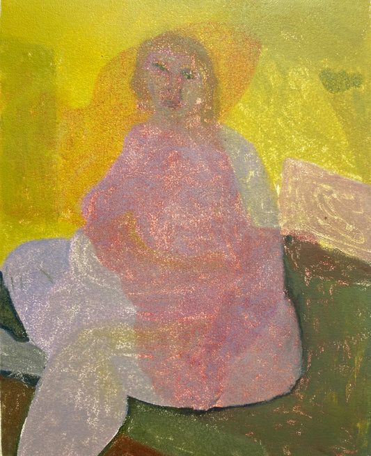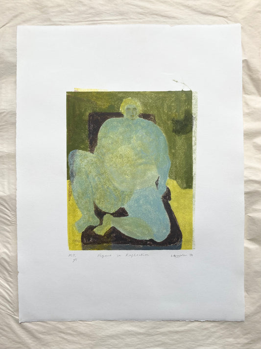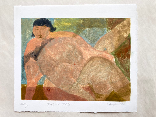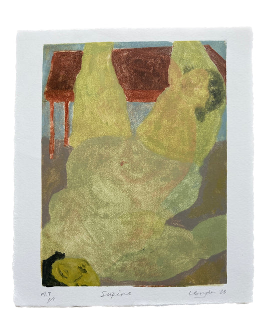 This new series created for The Curators invites the viewer into familiar interior settings to observe and be observed. Figures reclining, resting, contemplating are layered with one another in the printmaking process, in conversation with one another, ‘tête-à-tête’. This series looks to understand the principles of the gaze and act of painting and viewing figures, with dignity. By placing her own body in layers underneath, through and and over the models bodies, the artist introduces an element of self consciousness and disrupts the gaze. Each original print focuses on the bold yet soft shapes, stance and texture of the figures while embracing the transparency of the technique.