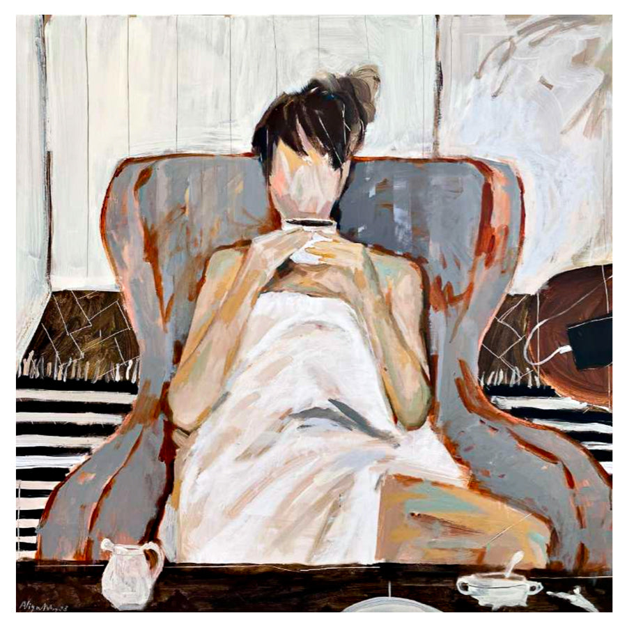 Born in Kharkiw, Ukraine Aliya Abs lives and works in Munich, Germany. Aliya Abs’s unique painting style involves a process of layering and obscuring the figures in her works, creating a sense of ambiguity and mystery. Her subjects are often depicted in vintage or historical settings, and the absence of facial features allows viewers to project their own emotions and interpretations onto the figures.