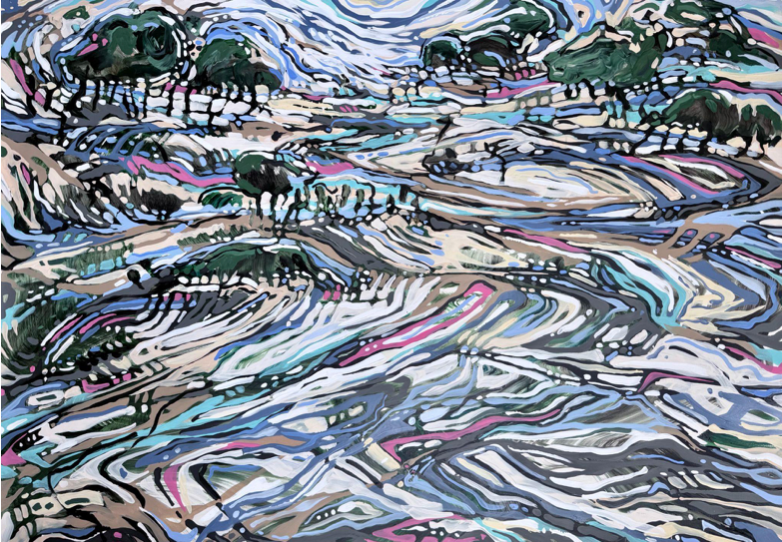Art critic Richard Leydier writes of Denis’s work as landscapes on the brink: floods, broken dams, and human figures carried by currents. Between the backwaters of the Seine and low-lying islands threatened by rising seas, water becomes a unifying element—whether fresh or salt—through which humans struggle, confront, and connect.