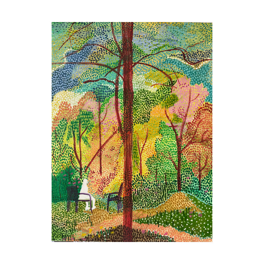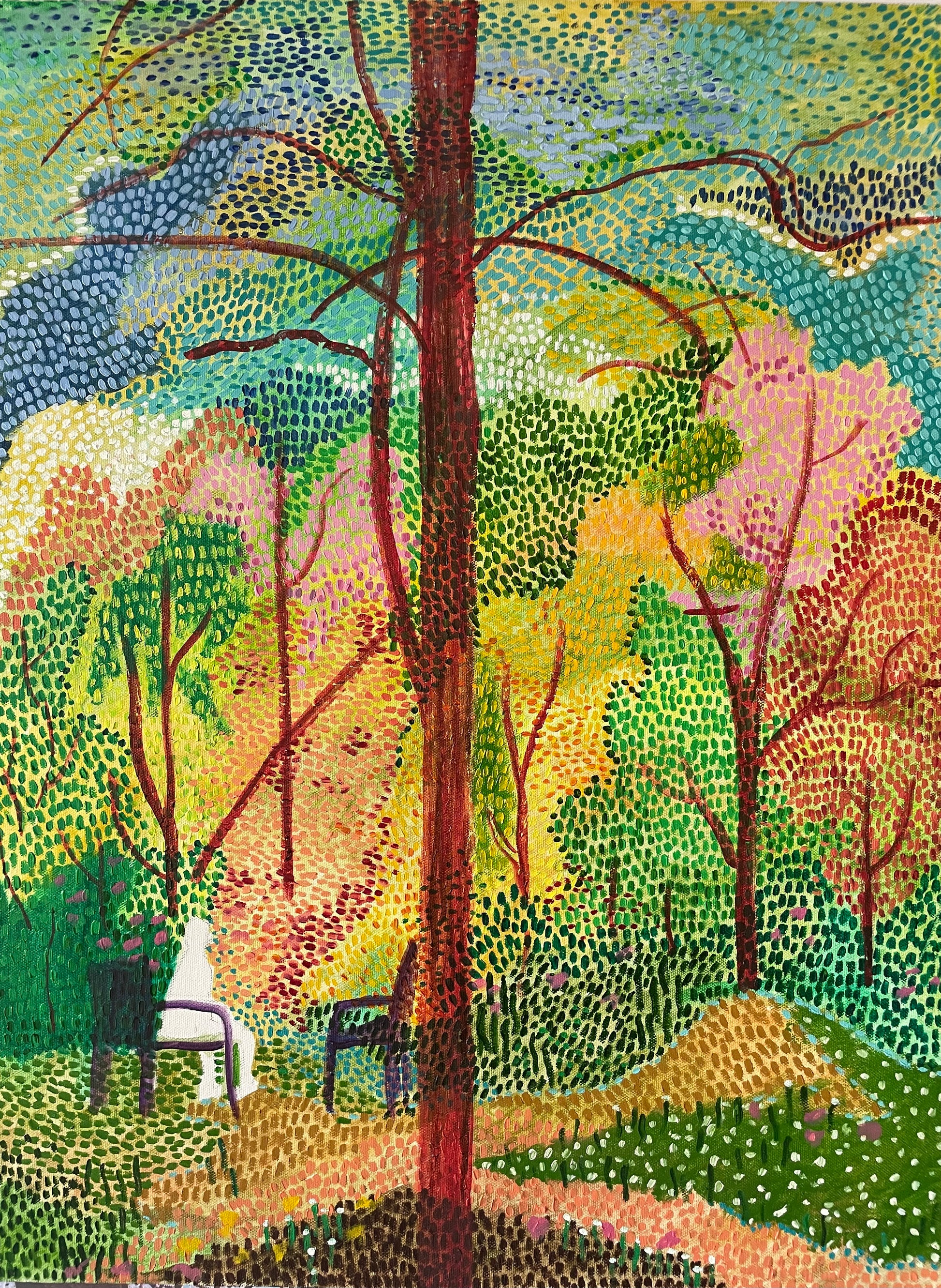 It is only in nature that this solitude becomes whole. There, one can hear the self again—uninterrupted, unfiltered. A quiet dialogue begins, not with words, but with awareness. In the painting, the figure sits on the edge of the chair—not relaxed, but alert. Listening. Turning inward. The world around him dissolves into abstraction, and only a few anchoring forms remain—just enough to remind him that reality, like solitude, is what we choose to hold onto.
