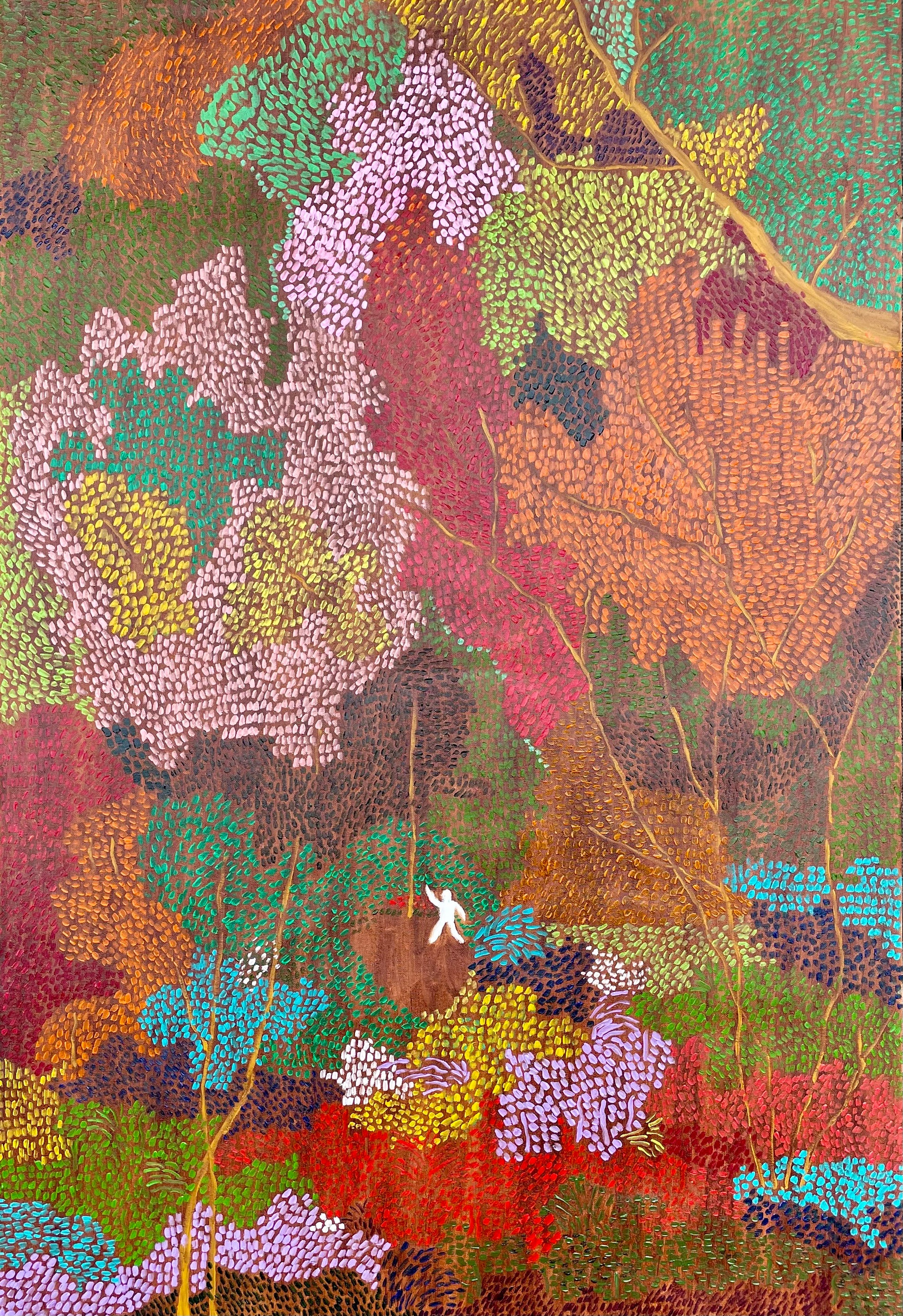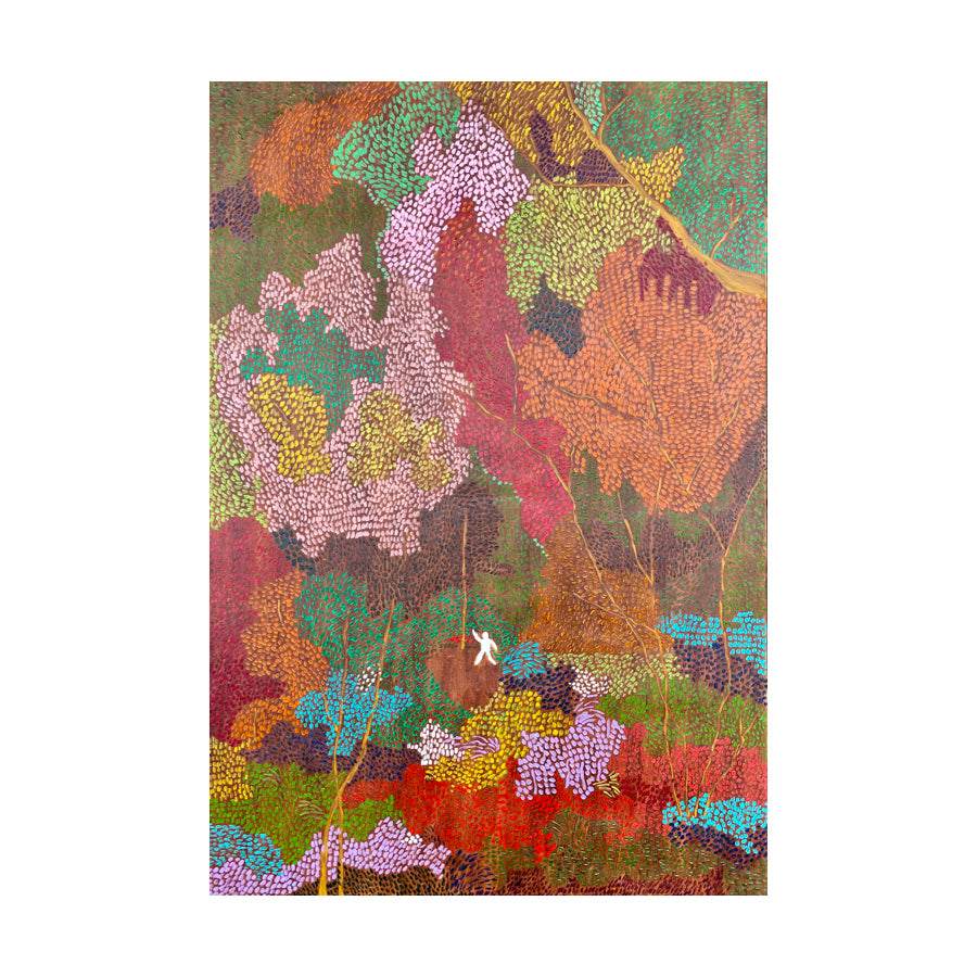 Loneliness, for Abhishek, is not only a state of loss but a transformative human condition—one that invites awareness, reflection, and change. Influenced by artists such as Vincent van Gogh, Matthew Wong, Yayoi Kusama, Kandinsky, and Mondrian, his paintings often center on a solitary figure within abstracted landscapes, where color and form replace literal space. By borrowing and extending visual languages from these precedents, Abhishek seeks to carry them forward, offering new landscapes in which loneliness is reimagined not as despair, but as a site of introspection and possibility.