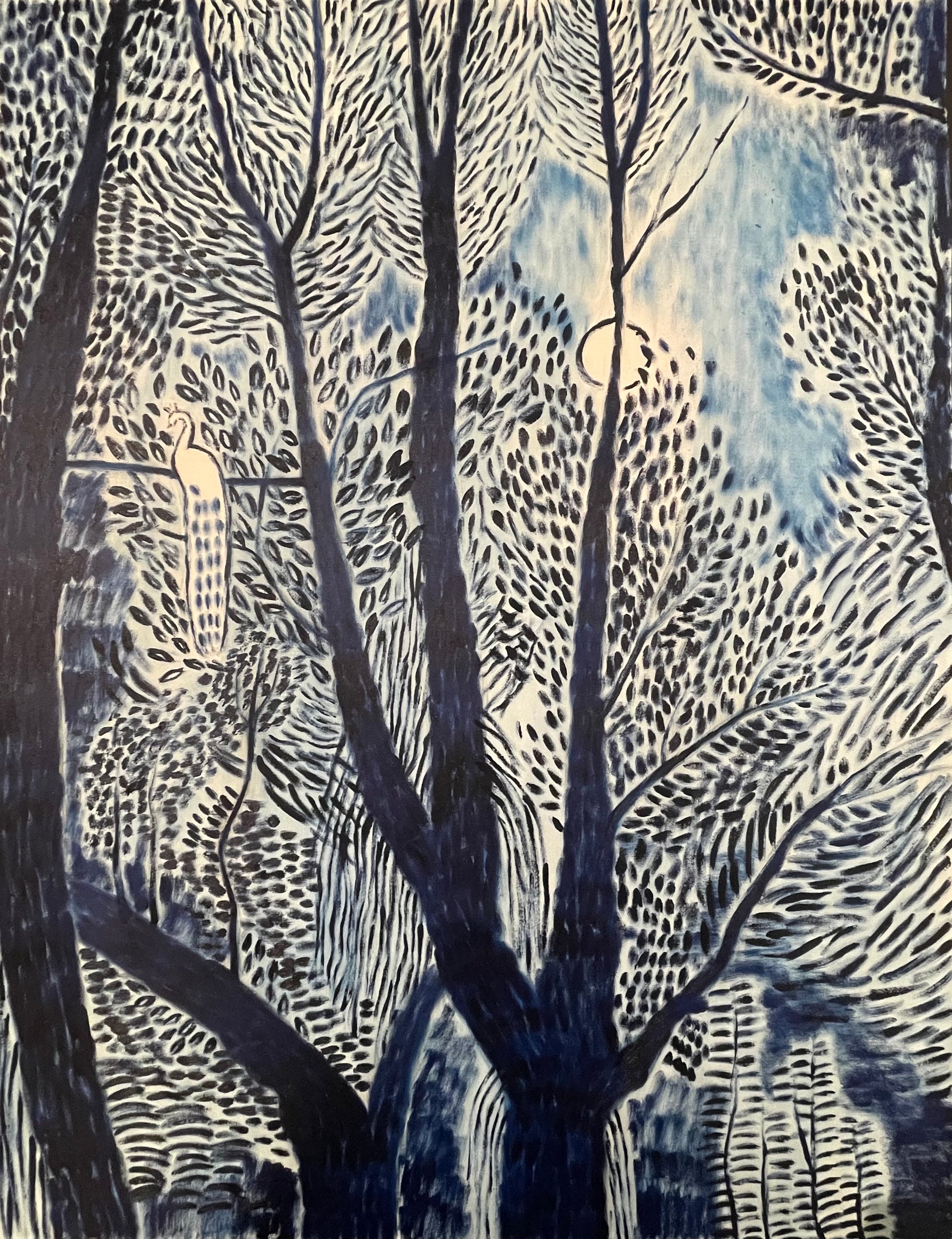 A lone peacock perches on a tree in the dead of the night. In this painting, loneliness is projected through the peacock thereby expanding the horizons of my artistic universe. Using other creatures to tell human tales and experiences isn’t something new and hence makes it recognizable, for example how Rousseau, also an outsider, self taught artist, who I relate to very much, used animals to depict human emotions in his paintings such as Tiger in a Tropical Storm or Combat of a Tiger and Buffalo.