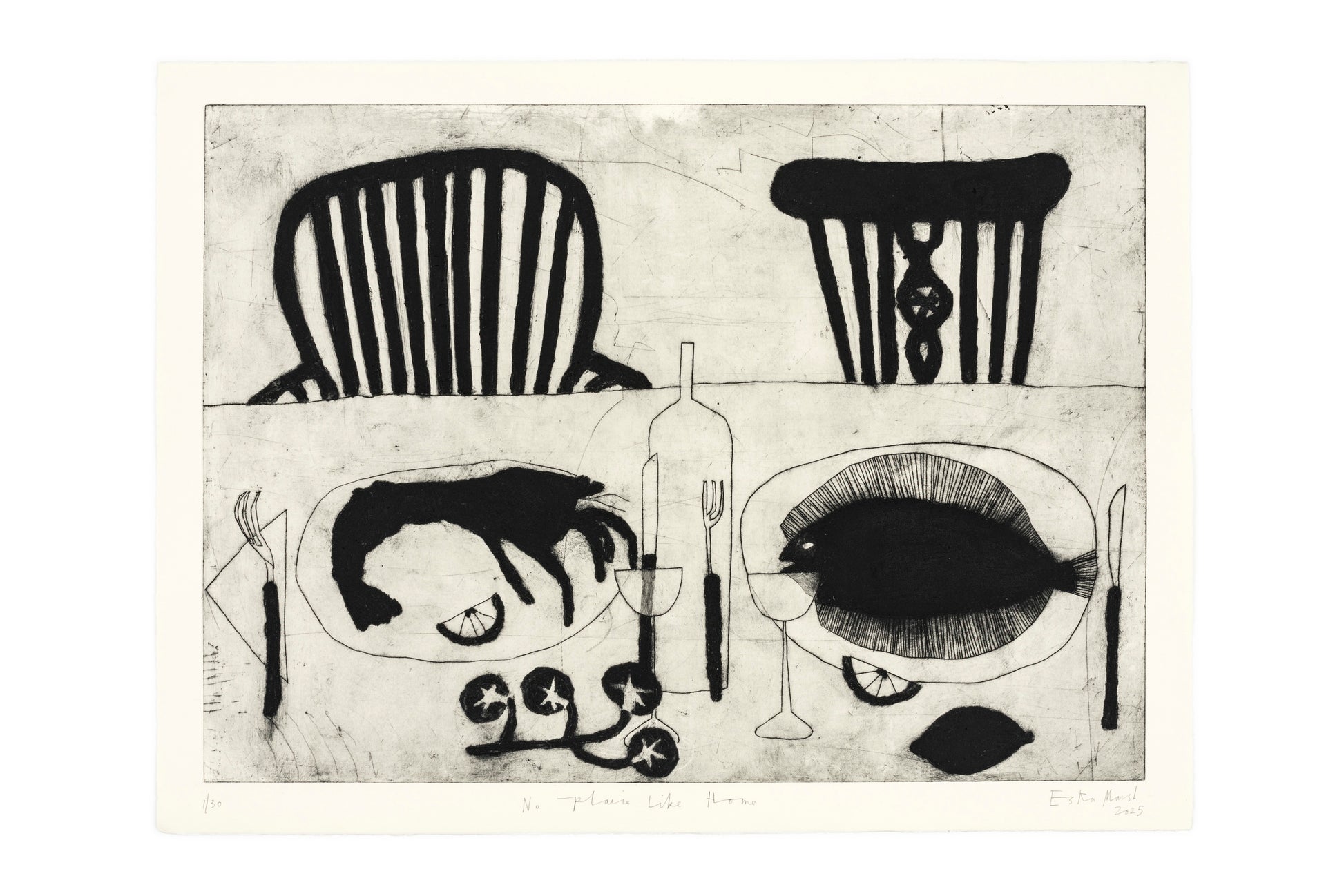 Eska Marsh (b. 1994) is a British contemporary artist based in Bristol, UK.Working primarily with drypoint and carborundum to create her monochromatic prints, Eska takes inspiration from post-war modernism, still life, and domestic objects, striking a distinctive balance between abstraction and the everyday.