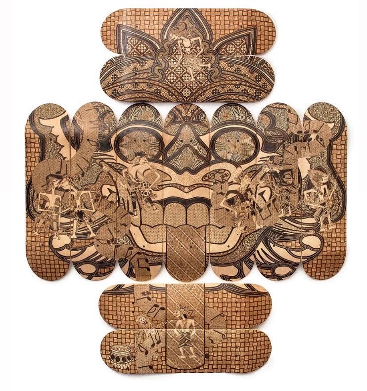 Coming from a poor background, he grew up in the overcrowded Bedok district of Singapore. The family lives five in one room; the little boy was only 10 years old when he was forced to work as a newspaper delivery boy or cleaning boy. This difficult start to life and his association with neighborhood gangs regularly led him to a “boys home” (a reformatory for boys). Dropping out of school at 12, the teenager draws solid reasons to avoid prison from the practice of BMX, skateboarding, and the energy of the musical trends that punctuate his alternative lifestyle. Silent, fierce and determined by nature, he has been practicing drawing in secret since 2003; he is fascinated by the art of tattooing. In 2020, in Paris, he left the restaurant that employed him and approached pyrography on a skateboard for the first time. His design diverts subjects dear to Nusantara, a historical name designating the foundational regions of his family culture (in Indonesia, Brunei, Malaysia and Singapore, the term is generally used to designate the Malay archipelago or the Malay kingdom which includes these countries ). Within his installation which includes eleven engraved skateboard decks, the artist recounts his social openness to the world, his street experiences and the acquisition of his self-taught knowledge. His life experiences are mythologized, subjectivized: the observer is thus invited to project his fantasies onto them and to question his own reality.