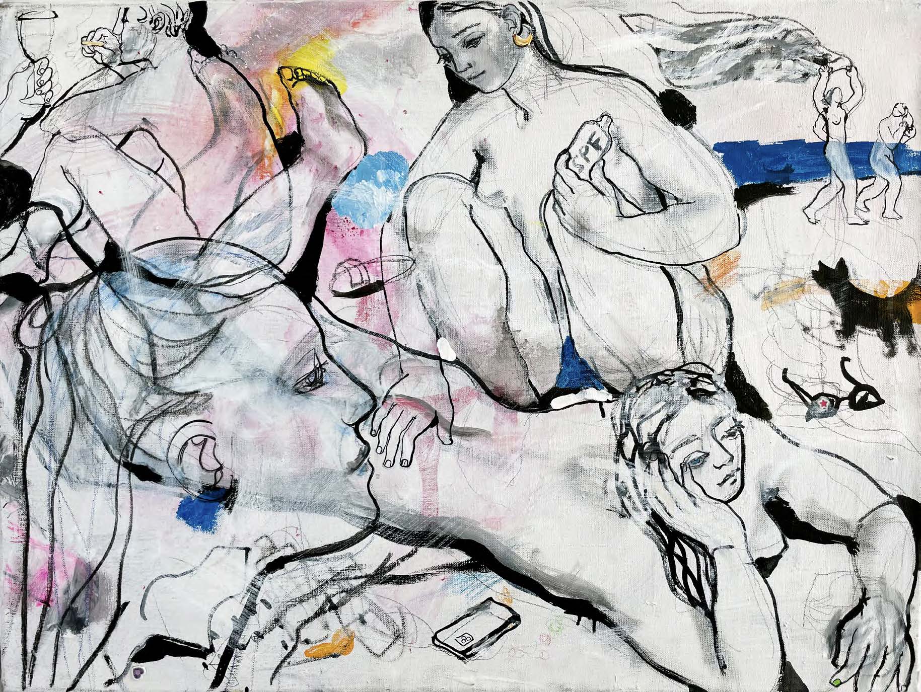 Kyiv-born and Berlin-based, Maria Naidyonova paints figures where emotion settles in the body between tenderness, distance, and daily life.